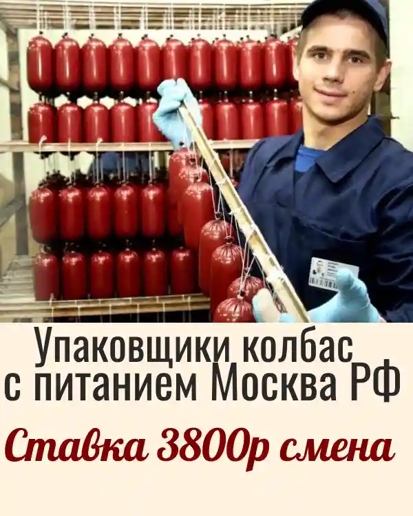 УПАКОВЩИК-ТРАНСПОРТИРОВЩИКИ КОЛБАС С ПИТАНИЕМ МОСКВА РФ 💲CТАВКА 3800 ₽ЗА СМЕНУ. 💲ЗАРПЛАТА114.000 РУБЛЕЙ ЗА 30 СМЕН С ПРОЖИВАНИЕМ 💸ЕЖЕНЕДЕЛЬНЫЙ АВАНС ДО 5000₽ ✔️ЗАКЛЮЧАЕТСЯ СРОЧНЫЙ ДОГОВОР НА 30 СМЕН ⏰ ГРАФИК РАБОТЫ 6/1, 7/0 ☀️СМЕНЫ ДНЕВНЫЕ 7:00-19:00 И🌙НОЧНЫЕ 19:00-7:00 🍔 БЕСПЛАТНЫЙ ОБЕД ЧТО ДЕЛАЕМ: ✅УКАДКА УПАКОВКА ГОТОВОЙ ПРОДУКЦИИ НА ПРОИЗВОДСТВЕННОЙ ЛИНИИ ✅ОТБРАКОВКА НЕСТАНДАРТНОЙ ПРОДУКЦИИ ♦️ПЕРВАЯ СМЕНА ОБУЧАЮЩАЯ НЕ ОПЛАЧИВАЕТСЯ 🦺 СПЕЦОДЕЖДА ПРЕДОСТАВЛЯЕТСЯ БЕСПЛАТНО (форма и обувь) 💥НЕОБХОДИМО БРАТЬ С СОБОЙ ТЕПЛЫЕ ВЕЩИ! НА ПРОИЗВОДСТВЕ +8 ГРАДУСОВ 🏥 МЕДКНИЖЖКУ ПОМОГАЕМ ДЕЛАТЬ С ВЫЧЕТОМ ИЗ ЗАРПЛАТЫ 3000 РУБЛЕЙ 📄ОФОРМЛЕНИЕ ПО САМОЗАНЯТОСТИ НАЛОГИ ОПЛАЧИВАЕТ ПРЕДПРИЯТИЕ. 🕵️ ПРОВЕРКА СЛУЖБОЙ БЕЗОПАСНОСТИ 📞НУЖНА РАБОТА ЗВОНИТЕ т.+79023031762