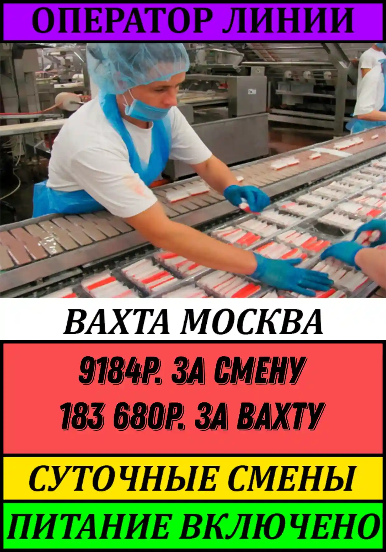 Описание вакансии Рыбзавод в Москве приглашает операторов линии крабовых палочек на вахту. Предлагаем выгодные условия труда и достойную оплату. ▌ Условия работы - Вахта длится 20 смен по графику 1/1. - Суточные смены. - Ставка составляет 9184 рублей за сутки. - Заработная плата за вахту — 183 680 рублей. - Оформление согласно Трудовому кодексу РФ. - Авансы еженедельно до 3000 рублей. - Зарплата выплачивается дважды в месяц (15 и 30 числа). - Окончательный расчет сразу после окончания вахты (по четвергам). ▌ Требования - Гражданство РФ. - Женщины до 45 лет. - Минимальный опыт работы на пищевом производстве с пониманием технологического процесса. ▌ Обязанности - Управление и контроль производственной линии. - Обеспечение бесперебойной работы линии и соблюдение технологических процессов. - Контроль качества продукции. ▌ Преимущества - Бесплатное двухразовое питание. - Проживание предоставляется бесплатно (квартира или хостел на 4-8 человек). - Место проживания находится в пешей доступности или транспортная доступность менее 10 минут. - Медицинская книжка оформляется за ваш счет (стоимость 5500 рублей). - Спецодежда предоставляется бесплатно. - Проверки службы безопасности отсутствуют, допускаются лица без уголовных татуировок. ⎯⎯⎯⎯⎯⎯⎯⎯⎯⎯ Если вас заинтересовала данная вакансия, обращайтесь для подробной консультации и оформления документов.