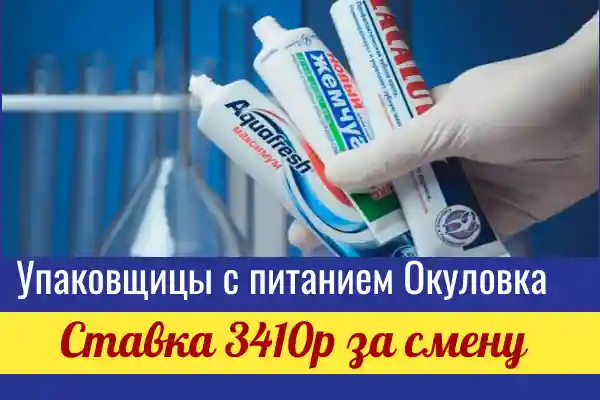 УПАКОВЩИЦЫ С ПИТАНИЕМ НА СКЛАД ЗУБНОЙ ПАСТЫ ДО 55 ЛЕТ РФ.РАБОТА В ОКУЛОВКЕ